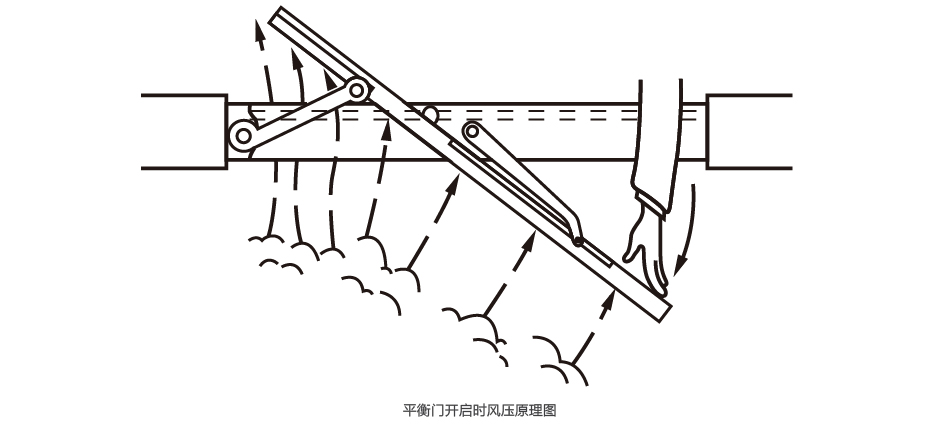 由于具有物理门轴的特点,利用风力产生的对于门的压力差,在门与门框之间设置隐藏式滑动门轴平衡支臂,可以借助风力达到在风力较大的环境中以很小的力量开启门。比同规格地弹簧门开启要省力至少1/2以上,普通人个手指可以推开,在大风天情况下,能有效减少正面风压达2/3以上。