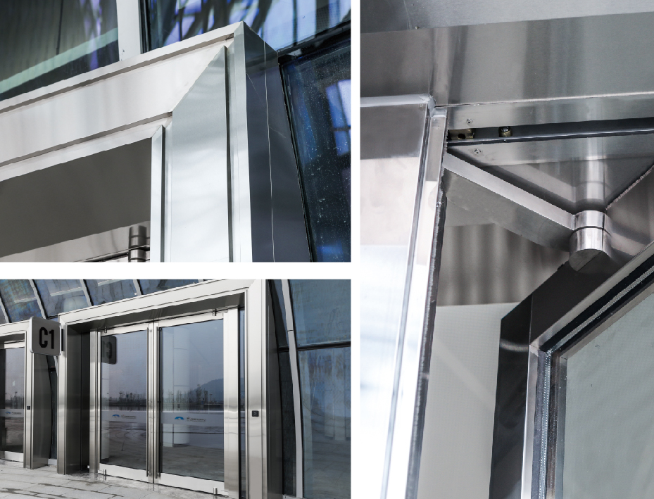 所有外露五金件 均采用高精度打磨的316/304不锈钢零件,门体表面则采用氟碳喷涂或不锈钢包饰处理。
