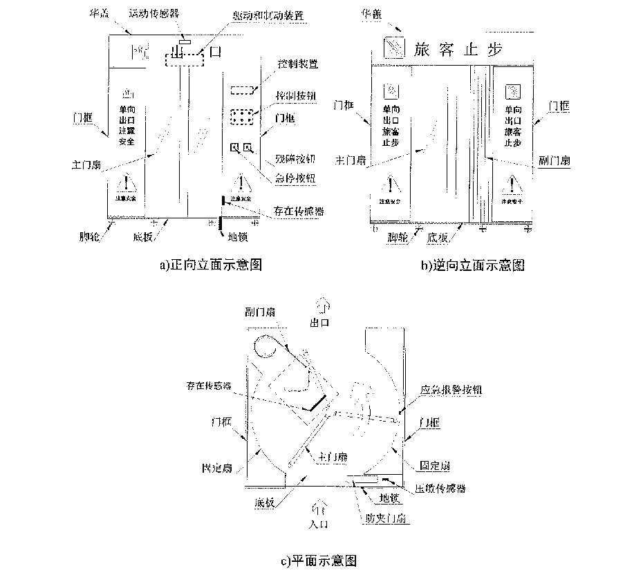 主门扇与副门扇之间的恒定间隙应确保旅客无法逆向通行。旅客和物体试图逆向通行时会触发存在传感器,主门扇立即制动,单向旋转门停止运行并发出警报提示。旅客和物体撤出后,单向旋转门应能自动恢复正常运行。