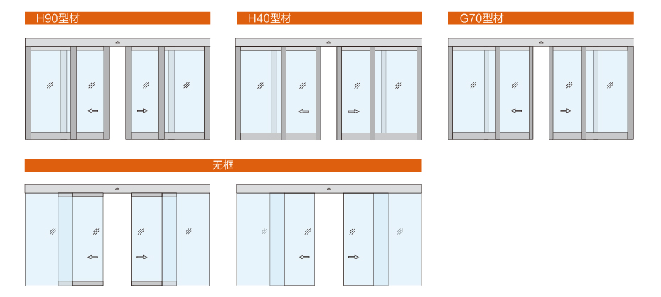 GS601/GS603/GS6011/GS6012自动平滑门为满足客户的各种定制需求设置了不同风格的门体造型。